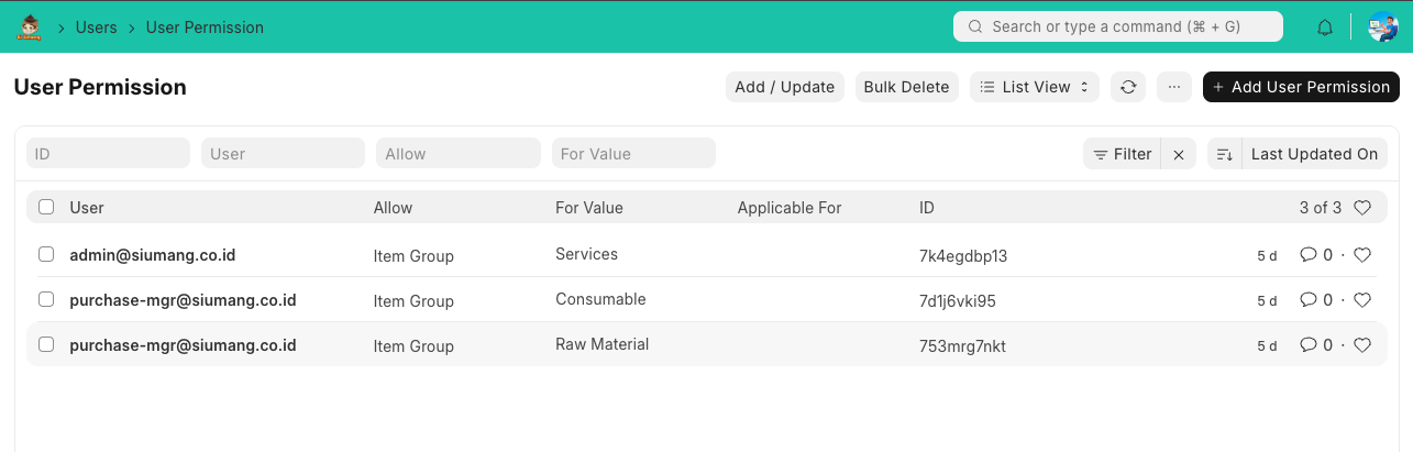 Anda dapat menggunakan tombol Add / Update, Bulk Delete, dan List View untuk mengelola daftar izin. Tombol + Add User Permission digunakan untuk menambahkan izin pengguna baru.
