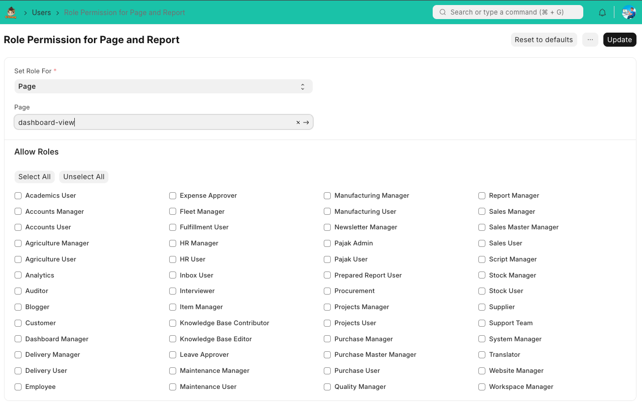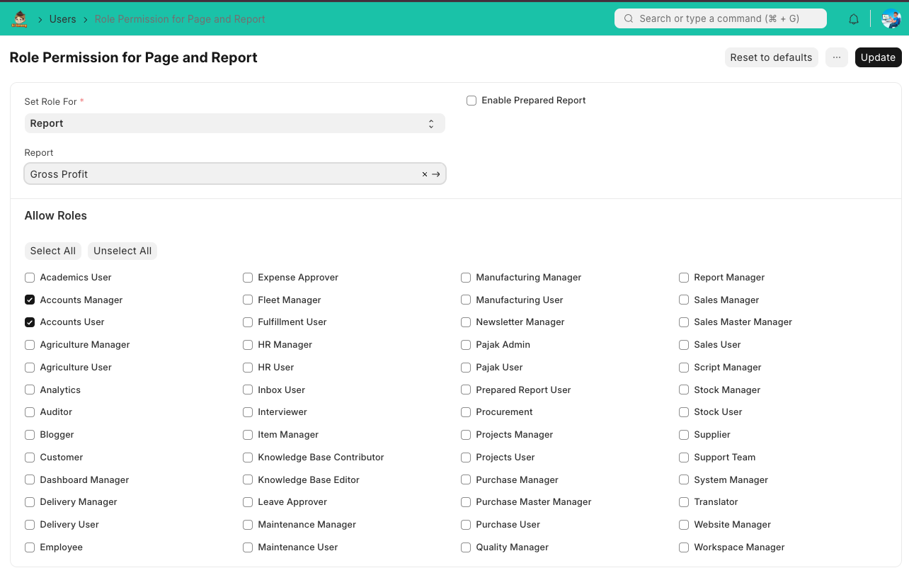 Setelah memilih laporan dan peran yang diizinkan, klik tombol Update untuk menyimpan perubahan. Anda juga dapat mengatur ulang ke pengaturan default dengan tombol Reset to defaults.