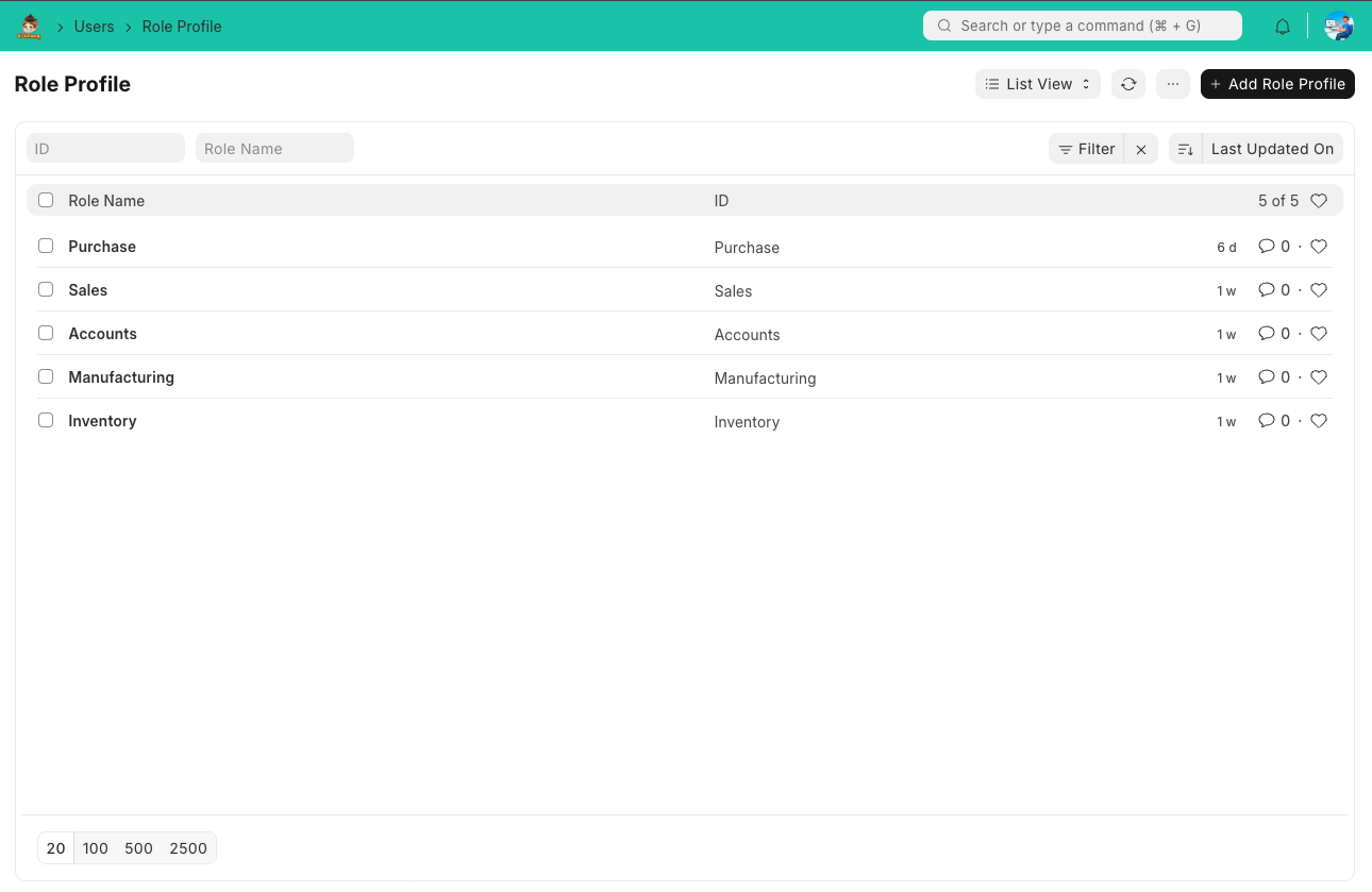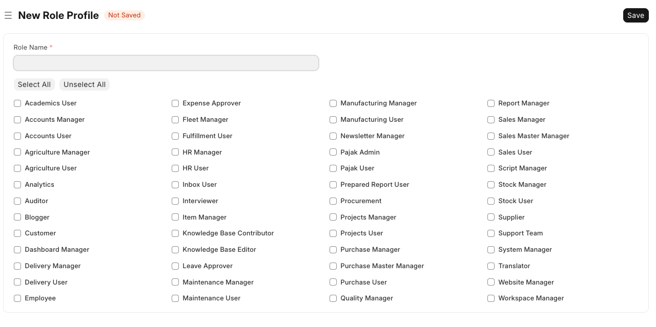 Di bawah "Role Profile", Anda akan melihat daftar lengkap semua peran yang tersedia di sistem. Anda dapat secara manual mencentang atau menghilangkan centang pada peran-peran ini untuk memberikan atau mencabut hak akses spesifik.